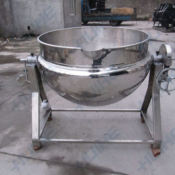 燃?xì)鈯A層鍋:就是人工打開氣閥,點(diǎn)燃燃?xì),加入食用油,待油溫達(dá)到烹飪溫度時(shí),加入適量的物料,人工翻鍋、攪拌,使物料在鍋里均勻受熱。待物料加工完畢后,關(guān)氣熄火,轉(zhuǎn)動手柄,通過蝸輪、蝸桿傳動裝置,使鍋體旋轉(zhuǎn)傾斜,將物料倒入另一容器內(nèi)。